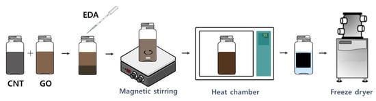 The synthesis process of the reduced graphene foam is illustrated in Figure 2 [9]. Ethylenediamine (24 μL) was added into the mixture of GO and CNT dispersion. The mixture was sealed in a glass vial and stirred with a magnetic stirrer. Moreover, it was heated for 6 h at 95 °C for the synthesis of the functionalized graphene-CNT hybrid hydrogel. After freeze-drying for 48 h, the solvent in the hydrogel was completely removed.