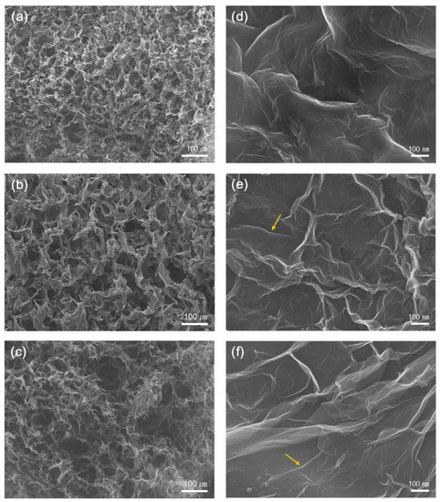 As shown in Figure 4, SEM images demonstrate the morphologies of hybrid foams incorporating GO (Figure 4a,d), graphene oxide-sodium dodecylbenzene sulphonate/single-walled carbon nanotubes (GO-SDBS/SWNT) (Figure 4b,e) and graphene oxide-cetyltrimethylammonium bromide/single-walled carbon nanotubes (GO-CTAB/SWNT) (Figure 4c,f), respectively. From the SEM images with a low magnification as shown in Figure 4a–c, the structure of interconnected networks ranging from ten to hundreds of micrometers is affirmed. While GO foam has pores less than a hundred micrometer, the pore size of GO-SWNT hybrid foams, such as GO-SDBS/SWNT and GO-CTAB/SWNT, is larger than that of GO foam. This resulted from well-dispersed SWNTs covered with a surfactant [25].