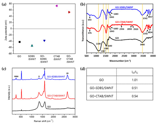 The results of (a) Zeta-potential, (b) FT-IR spectra, (c) Raman spectra, and (d) ID/IG values of GO, GO-SDBS/SWNT, and GO-CTAB/SWNT.
