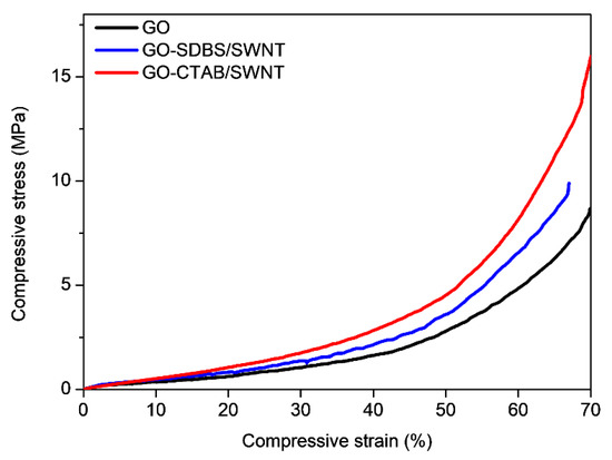 Stress–strain curves of GO, GO-SDBS/SWNT, and GO-CTAB/SWNT under compression.