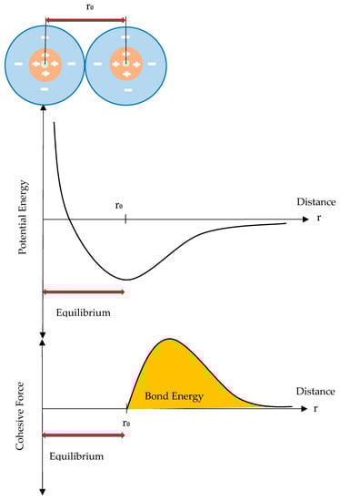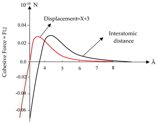Figure 1 shows a schematic of the behavior between the two atoms and the energy required for their separation []. Accordingly, the cohesive force between the atoms acts in a nonlinear manner in separation and the assumption of the linear behavior for this force is not correct.