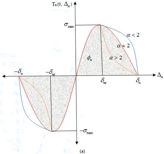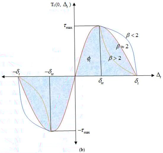 Appendix A describes how to calculate these parameters in the tangential mode []. If the energy values of the normal and tangential fracture are equal, then Equation (7) becomes the same as Equation (8). m and n are calculated by means of the Equation (9), based on the shape parameters in the PPR model (α, β) and the initial slope indicators, λn and λt which are defined by the Equation (10).