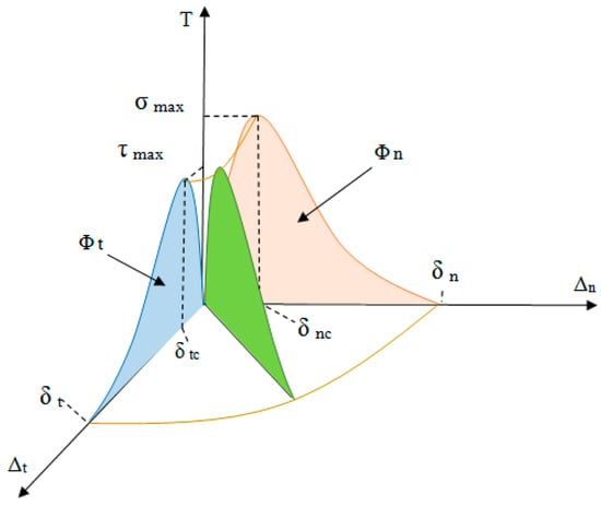 Figure 3 schematically shows the traction–separation diagram in the normal and tangential mode based on the PPR potential model []. In Figure 4, the traction–separation diagram is shown in the mixed mode. Since there is a good agreement between the Lennard–Jones variation diagram in Figure 2 and the PPR model in Figure 4, this potential can be used as the basis for defining the adhesive properties in the form of nonlinear elasticity at the interface, whose main parameters values are based on the L–J potential.
