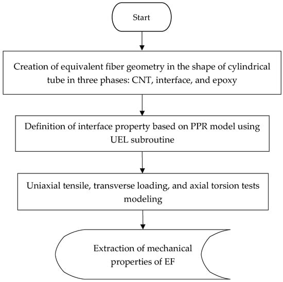 In this section, the finite element is simulated according to Section 2.3. Since the ABAQUS software library does not include cohesive elements with the nonlinear elastic behavior, a user element subroutine (UEL) was written to define the interface behavior based on the PPR potential model. The input parameters of the model were extracted and applied, using the L–J atomic potential by using Equations (1)–(4), as shown in Figure 2. The finite element simulations of the uniaxial tensile, transverse loading, and axial torsion tests have been performed. From finite element analysis (FEA) results and Equations (12)–(17), the mechanical properties of the EF, including transverse and longitudinal Young’s modulus, the shear modulus, and Poisson’s ratio were extracted. Figure 6 illustrates the steps of the modeling at nanoscale.