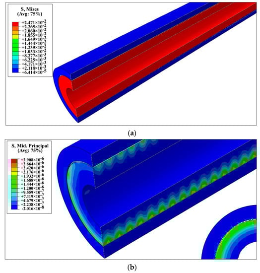 Results of finite element simulation of equivalent fiber (EF) under uniaxial loading (a) contour plots of von Mises stress (b) mid-principal stress distribution.