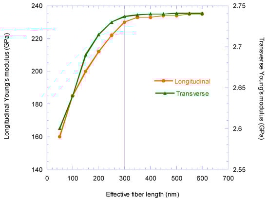 Due to the aspect ratio of CNTs (~700), the equivalent fiber boundary conditions are defined to model an infinite length for the carbon nanotube. Figure 9 illustrates variation in the longitudinal and transverse Young’s modulus with respect to the change in EF length from 50 nm to 600 nm. This diagram shows that the longitudinal Young’s modulus does not change significantly for EF lengths around 300 nm, and for fibers length over 300 nm, the change in transverse Young’s modulus of EF changes is negligible; hence, in the modeling of EF its lengths was considered equal to 300 nm.