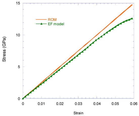 Comparison of longitudinal stress–strain behavior of the finite element analysis EF model and the rule-of-mixtures (ROM).