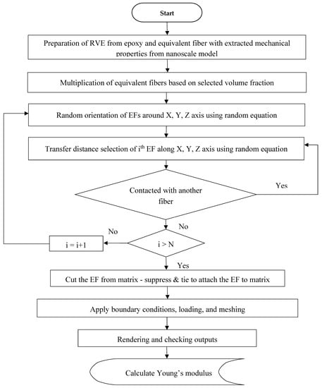 This study has been done for volume fractions of less than 1%, and dispersion is done by ultrasonic energy. Reducing the volume fraction of CNTs has a direct effect on the agglomeration []. The agglomeration of CNTs is ignored in this section and the effect of CNTs clustering by the FEM is investigated in the next section. In the simulation of the RVE, it is assumed that the bond between the EF and the matrix is a perfect bond and the position and angle of the reinforcement are chosen randomly. This model is implemented by the Python script in the ABAQUS, which allows the script to select and modify the properties and dimensions of the matrix and the reinforcement, and the values and properties of the EF are based on nanoscale outputs. Figure 11 shows the RVE with dimensions of (1500 × 1500 × 1500) nm3. The Young’s modulus of the RVE was calculated using Equation (18). In Figure 12 the algorithm of the RVE simulation is shown. The results of this model, as the full dispersion model, are presented in Section 5.