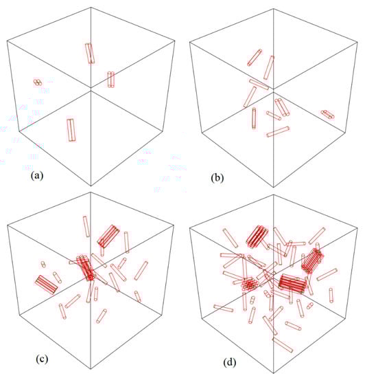 3D view of the RVE with clustering of CNTs in four colonies: (a) 0.18 wt%; (b) 0.36 wt%; (c) 0.9 wt%; (d) 1.8 wt% (half of the EFs are clustered at four random point).