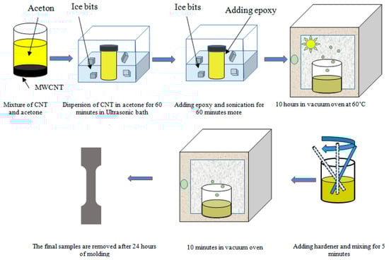 Figure 15 illustrates the process of nanocomposite specimens’ production. To make the specimen, the CNT was first mixed with acetone and placed in an ultrasonic bath for an hour. After that, the epoxy was added and placed in an ultrasonic bath for another hour. This process dispersed CNTs in the epoxy. In the next step, for the removal of acetone and air bubbles, the nanocomposite was placed in a vacuum oven for 10 h (to be sure, the mass of the mixture was measured after removal from the oven). Then, by adding the hardener, the mixture was slowly mixed for 5 min and placed in a vacuum oven for 10 min. At the end, the nanocomposite was poured into the dogbone mold and after 24 h, the specimens were ready for tensile testing. Tensile test was conducted according to the ASTM-D638V standard with the universal testing machine SANTAM-STM50. The values of the Young’s modulus obtained from this experiment were compared with the results of the simulation and the Halpin–Tsai equation in Figure 16.