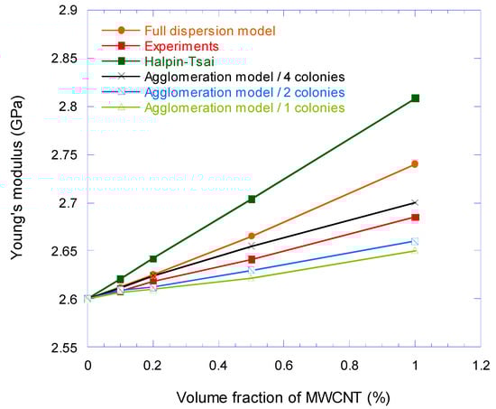 The FEA simulation results are compared with Halpin–Tsai model defined in Equations (A5)–(A9) in Appendix B, along with the experimental results. The results of nanocomposite Young’s modulus form experiment, Halpin–Tsai and full dispersion FEA simulation together with agglomerated CNTs FEA models for 1, 2, and 4 colonies are compared in Figure 16. The results show that the values obtained from simulations are between the results from Halpin–Tsai equation and experiments and the agglomerated CNTs FEA model with four colonies is the closest to the experiment. This shows that the dispersion of CNTs in the epoxy was not perfect and there were some agglomerations.