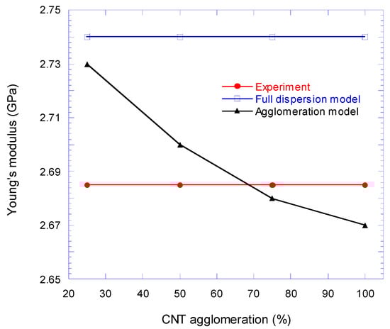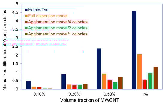The full dispersion model showed that for MWCNTs loading at 1 Vf.%, the Young’s modulus of epoxy nanocomposite was increased by 5%. This number was 1.7% more than the experimental value, while the result from the Halpin–Tsai equation overestimated 4.6% the experimental value at the same volume fraction. If the results are compared with the rule-of-mixtures, the difference will be more than 20%. The proximity of the results of the FEA modeling with the experimental ones showed the effect of interface modeling on the elastic behavior and the Young’s modulus of the nanocomposite. In Figure 17, the normalized differences of Young’s modulus, which are derived from the FEA simulation and Halpin–Tsai equation, are compared with the experimental results. As can be seen in this figure, by increasing the amount of the CNT volume fraction, the difference between the experimental results and the simulation increases and the highest difference at the volume fraction of 1% is 2.05%. However, this deviation is approximately half less than the difference of Halpin–Tsai equation and the experiment. The augmentative growth of normalized difference between the full dispersion model and experiment by increasing the volume fraction of CNT is rooted in agglomeration at higher loading of the CNT nanoparticles. Figure 18. shows the effect of clustered CNTs percentage (in four colonies) in a 1% volume fraction on Young’s modulus. As can be seen, the increase in agglomerated CNTs volume fraction decreases the modulus of the nanocomposite.