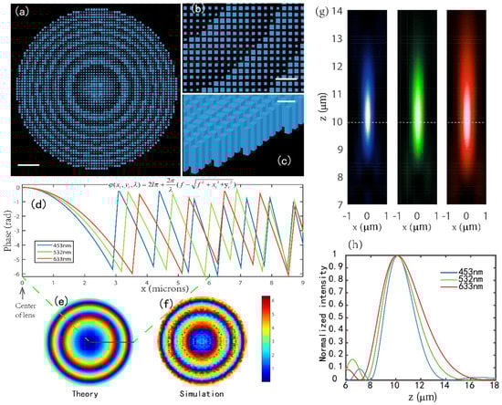 Figure 2a–c show the metalens built in FDTD solution environment with NA = 0.75 and = 10 μm. Due to the large size of the proposed metalenses and our limited computational resources, we analyzed the performance of the metalenses with similar = 10 μm but smaller NA. Three distinct metalenses with NA = 0.51 were demonstrated with respective design wavelengths of 453, 532, and 633 nm. Figure 2d shows the required phase profile to realize metalenses at the three design wavelengths. Figure 2e is the ideal phase distribution at the transmitted facet of metalens design for λ0 = 633 nm, Figure 2f is the simulated result of phase distribution at the plane which is 12 nm above the transmitted facet of metalens of 633 nm. We can note that the designed metalens can work out very symmetric phase distribution as expected, which directly ensures the high symmetry of the focusing spots for designed metalenses. Figure 2g,h show intensity distributions in the focal region (x-z plane) and along z-axis for the three metalenses, respectively. It is clear that the three metalenses function well, as expected, and that the simulated focal spots arrive accurately at the design position of = 10 μm.