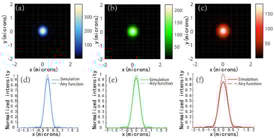 (a–c) simulated focal spots of the metalenses at their design wavelengths of (a) 453, (b) 532, and (c) 633 nm, respectively. (d–f) Corresponding horizontal cuts of focal spots shown in (a–c) with full width at half-maxima of 470, 550, and 650 nm, respectively. An ideal Airy function is overlaid onto each horizontal cut.
