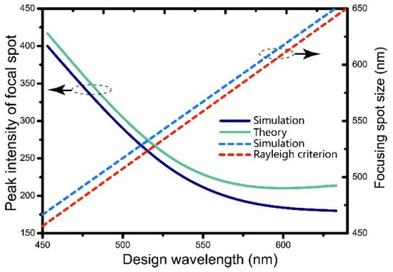 We also quantitatively show the comparison in Figure 4 of the simulation results and the theoretical calculation of the PFIs and sizes of focal spots for different design wavelengths ranging from 450 nm to 640 nm. It is notable that the PFIs obtained by the two methods consistently decrease, especially for smaller wavelengths, with increasing design wavelength. Note that the simulated focal spot sizes are only about 20 nm lager than the diffraction-limited values (Rayleigh criterion) at different design wavelengths, which proved the high focusing performance of the metalenses based on the proposed slab waveguide model.