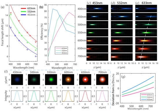 (a) Simulated focal length shifts (symbols) of metalenses designed for λ0 = 453, 532, and 633 nm compared to diffractive lens (lines) according to Equation (6), respectively. (b) The wavelength dependence of focusing efficiency for the three metalenses at visible spectrum. All the metalenses have the same NA of 0.51 and focal length of 10 μm. (c–e) Intensity distributions in line scale (in false colors corresponding to their respective wavelengths) in the x-z plane of the three metalenses at different wavelengths ranging from 400 nm to 700 nm, respectively. The wavelengths of incidence are denoted on each picture. The direction of incidence is towards the positive z-axis. (f) Normalized intensity profiles along the white dashed lines of (e) for metalenses, respectively, designed for λ0 = 633 nm. The white dashed lines pass through the center of focal spots. (g) The chromatic deviations from the ideal spots for three metalenses in visible spectrum.