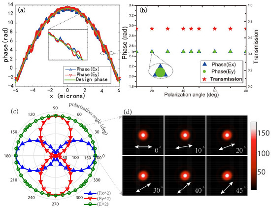 which can be explained by Figure 6a,b: Figure 6a shows the simulated phase profiles of the x-component (blue curve) and y-component (red curve) as well as the design phase profile (green curve) according to Equation (1) for the antenna array along the x axis under the incidence light with 10° polarization angle. We also extract a single nanopillar in Figure 6a and research its transmitted phase and amplitude variation under different incidences with polarization angle ranging from 0 to 90°, as shown in Figure 6b. It is notable that the x-component and y-component transmitted phases and amplitudes of each square nanopillar are consistent with the design values at different polarization angle of incidence, which makes the proposed metalens share the same wavefront for different polarized lights, or in other words, polarization-insensitive to incident light. We can further prove it using the simulated results shown in Figure 6c, although the x-component (blue curve) and y-component (red curve) PFI vary with the different polarization angle of incident light, the total PFI = PFIx + PFIy (yellow curve) remains identical and their focal spots are unchanged (Figure 6d). As a circularly polarized beam can be regarded as a superposition of two linearly polarized beams, whose amplitudes are identical and polarization directions are perpendicular and have phase differences of π/2, the total focusing result can still be viewed as the superposition of two components (see Figure S4), thus the proposed metalenses are also insensitive to circularly polarized inputs.
