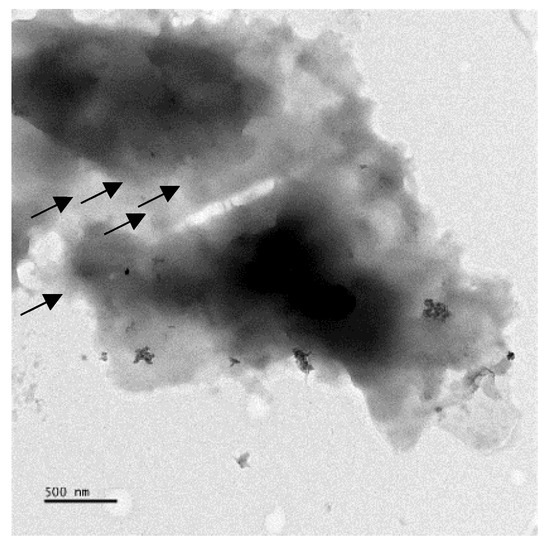 TEM image of few-layer Graphene oxide that (Black arrows) stacked on top of one another. The scale bar shown on the bottom bar is 500 nm.