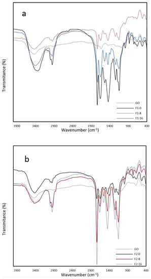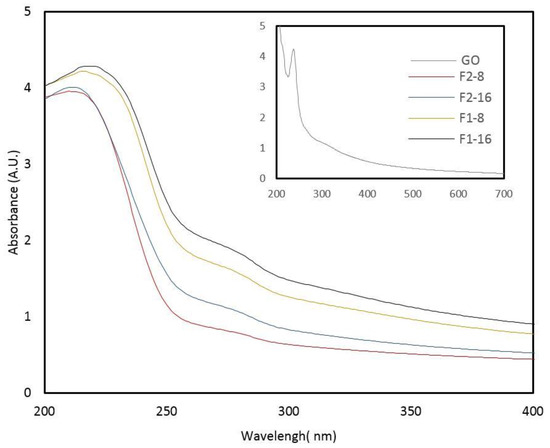 To identify the GO content, UV-Vis spectroscopic studies were performed, Figure 3. It is inferred that the presence of GO contents is identified through the optical absorption of GO dominated by the π–π stacking at about the more intense peak of 230 nm [33,34]. The π–π stacking peak on film samples with GO contents was recorded with a blue shift when compared with GO at 212, 213, 216, and 220 nm for F2-16, F2-8, F1-8, and F1-16, respectively. This can be due to linking units of GO, such as C–O and C=O, and C=C bonds that altered during in situ polymerization. However, a red shift was observed within the film samples by increasing the GO contents. This can be attributed to owning a higher intensity of C=C and oxygen-containing bands in samples with higher GO contents. This statement can be confirmed by the intensity of FT-IR peaks of F1-16 and F2-16, which can be due to the non-uniformity of the GO dispersion in the high loadings that possibly happened during in situ polymerization.
