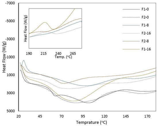 In the heating phase of the samples with GO contents, an irreversible exothermic event was also observed at 233.13 °C and 221.17 °C that is attributed to the reduction (defunctionalization) of graphene oxide in samples owning higher GO contents (F1-16 and F2-16) (Figure 4). This feature was not observed in DSC profiles that were recorded in the cooling phase (not shown). Defunctionalization, which is ascribed to decomposition of the labile oxygen functionalities, such as –OH, –COOH, and –C=O, can be referred to the density of free functionalities on the surface and edges of GO that probably have not been bonded during in situ polymerization and casting afterward. In the case of F1-8 and F2-8 with less GO contents, it is likely that the formation of covalent bonds within the polymeric matrix renders the oxygen functionalities and this can mark F1-8 and F2-8 less amenable and more stable samples by increasing temperature as compared to other samples.