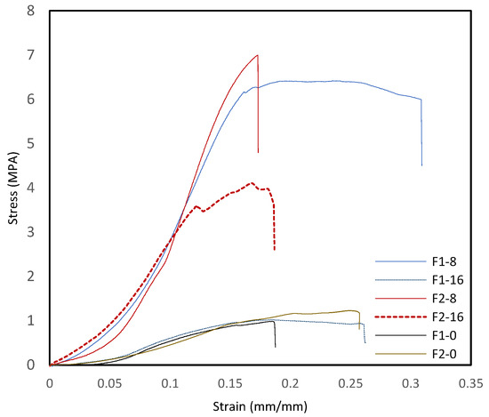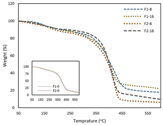 The thermal stability of the samples was also measured using TGA analysis. The results are shown in Figure 5. A mass loss of about 10% was recorded by 200 °C, which can be due to the loss of acidic functional groups in either ASC or GO. While the mass loss was then carried out with the same rate till 30% at 350 °C in samples without GO contents, a higher thermal stability was observed from the higher residual mass of 80%, 76%, 74%, and 71% by 350 °C in F2-16, F1-8, F1-16, and F2-8. Then, the samples immediately encountered a significant decrease in temperature ranges from 350 °C to 443 °C for F1-16, F2-16, and F2-8, this rapid mass reduction occurred for F1-8 in a wider range of temperatures between 350 °C to 460 °C. Additionally, F1-16 exhibited a higher residual mass of 23% at 550 °C in contrast to other samples with GO contents; 19%, 11%, and 7% for F1-8, F2-16, and F1-8, respectively. These results suggest that GO contents and branching densities are both responsible for thermal stability of nanocomposite, since a more stability was observed in higher GO contents and branching densities (F2-16).