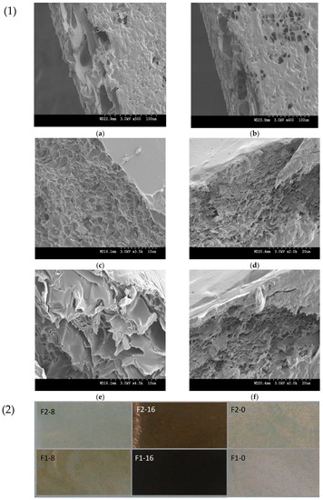 (1) Investigation of cross-sectional morphology of porous composite films of ASC-g-P(MMA-co-EA) without GO contents: (a) F1-0, (b) F2-0; the multilayer nanostructure of ASC-g-P(MMA-co-EA) with GO contents: (c) F1-8, (d) F1-16, (e) F2-8, (f) F2-16; and, (2) the color appearances of nanocomposite films on a light blue substrate.