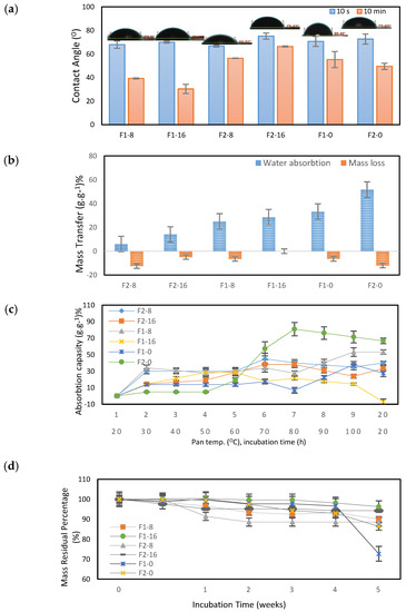 (a) The water contact angle vs. time after 10 s and 10 min; (b) water absorption (hydration degree) and mass loss after incubation time of 12 h at room temperature; (c) Water absorption capacity of the samples as a function of temperature in percentage; and, (d) Mass residual percentage vs. incubation time (week).