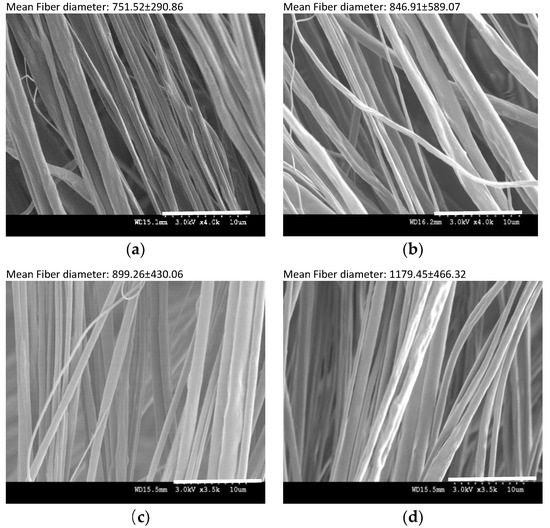 The effect of the GO contents on the mean fiber diameter and the uniformity (standard deviation value) of the electrospun fiber from the GO-ASC -g-P(MMA-co-EA nanocomposite: SEM images of (a) M1-8; (b)M1-16; (c) M2-8; and, (d) M2-16; the scale bar shown on the bottom bar is 10 µm.