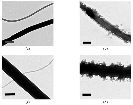 Finally, to better understand the GO arrangement in the structure of the fibers we studied the TEM image of the electrospun fibers of the samples with GO contents. As shown in Figure 10, distinguished appearance can be observed on the surface of the nanofibers bearing more GO contents (M1-16, and M2-16) as compared with nanofibers with less GO contents (M1-8 and M2-8). Even though this notable GO decoration on fiber surface can be beneficial for applications that require highly active functional groups of GO on the surface of the fibers, the addition of GO contents can simply increase the average fiber diameter and decrease its uniformity.