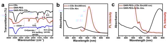 (a) The Fourier transform infrared (FT-IR) spectra of CDs, GNR-PEG and GNR-PEG-CDs; (b) the UV-vis and PL spectra (excited at 480 nm) of CDs; (c) the UV-vis and PL spectra (excited at 480 nm) of GNR–PEG–CDs.