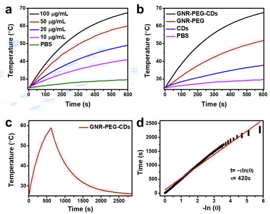 (a) The concentration-dependent temperature elevation; (b) a time-dependent increase in the temperature; (c) photothermal effect of GNR-PEG-CDs; (d) the time constant for heat transfer from the solution is determined by applying the linear time data from the cooling stage in (c) versus the negative natural logarithm of the driving force temperature. Samples were carried out under 808 nm (1.5 W cm−2) irradiation.