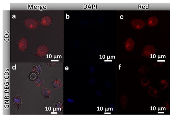The remarkable optical properties of GNR–PEG–CDs make it a suitable agent for cancer imaging. First of all, we examined the incubation of the probes with HeLa cells. CLSM images exhibit that the GNR–PEG–CDs nanorods could be efficiently taken up into the cells and distributed mainly in the cytoplasm region (Figure 4d–f). Comparably, free CDs are distributed in both the cytoplasm and the nucleus regions (Figure 4a–c).
