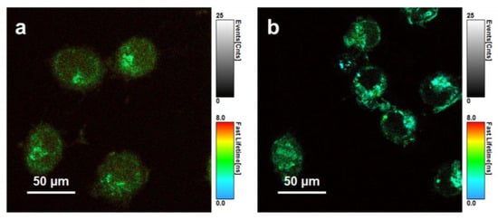 For instance, despite the excellent sensitivity of FL imaging, its limited tissue penetration depth [,] and the finite information derived from fluorescence intensity micrographs of cells have compromised its diagnostic abilities. Meanwhile, fluorescence lifetime imaging microscopy (FLIM) has been proven as a highly advanced spectroscopic method for biological and biomedical applications []. The excellent performance of FLIM can contribute to high contrast images that are independent of excitation intensity and fluorophore concentration []. Moreover, it provides both temporal and spatial information of intracellular structures labeled fluorescently by detecting changes in the fluorescence lifetime (FLT) []. Thus, the integration of FLIM with FL imaging could be more favorable for accurate cancer diagnosis. Therefore, there is a need to find more appropriate fluorescent probes for FLIM and FL imaging.