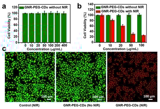 (a) In vitro viability results of HeLa cells treated using GNR-PEG-CDs without lasers irradiation (from 0 to 400 µg mL−1); (b) in vitro viability results of HeLa cells treated with GNR-PEG-CDs (from 0 to 100 µg mL−1); (c) CLSM images of GNR-PEG-CDs (100 µg mL−1) before and after NIR irradiation with Calcein-acetoxymethylester and propidium iodide (PI) co-staining. Scale bars: 100 μm.