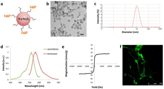 Magnetic iron oxide nanoparticles that were labelled with the fluorescent probe rhodamine were synthesized and covalently conjugated to NGF through a spacer arm of polyethylene glycol (Figure 1a). Size and uniformity of the particles were characterized while using transmission electron microscopy imaging. TEM images demonstrate spherical particles with an average diameter of 18 ± 4 nm (Figure 1b). The hydrodynamic diameter of the NGF–MNPs, as determined by dynamic light scattering is 99 ± 47 nm (Figure 1c), whereas neat MNPs present a diameter of 45 ± 17 (Supplementary Materials, Figure S1). The difference in diameter size verifies NGF conjugation to particles. Fluorescence spectra of NGF-MNPs, measured by fluorimeter, reveal an excitation peak at 559 nm and an emission peak at 579 nm in water (Figure 1d). These results show that rhodamine fluorescent properties remain, and that the particle synthesis process does not interfere with the fluorophore’s spectrum. Magnetic measurements show that the M(H) curve of the NGF-MNPs has no hysteresis loop, indicating the superparamagnetic behavior of these particles (Figure 1e). The saturation magnetization of the NGF-MNPs is ~27 emu/g. The saturation magnetization of bulk maghemite is about 76 emu/g []. The difference between the values derives from the fact that the NGF-MNPS are not pure maghemite, and they are composed of additional materials (i.e., gelatin, Rhodamine Isothiocyanate).
