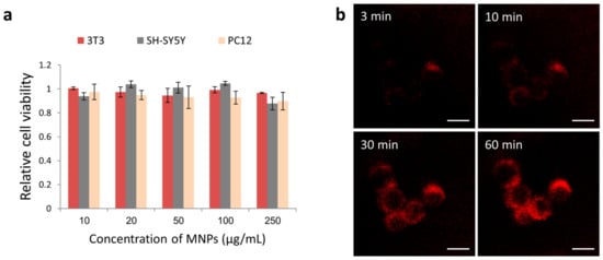 Although several formulations of iron oxide nanoparticles have already been approved by the FDA as MRI contrast agents for clinical use [,], other iron oxide nanoparticles show toxic effects [,]. Therefore, the toxicity level of the particles must be tested. Cell viability XTT assay showed that the NGF-MNPs exhibited no significant cytotoxicity to several different types of cells, including rat adrenal pheochromocytoma cells (PC12), human neuroblastoma cells (SH-SY5Y), and mouse embryonic fibroblast cells (NIH 3T3), even under high concentrations up to 250 µg/mL (Figure 2a). Cellular uptake of NGF-MNPs was studied by time-lapse fluorescence microscopy. Already three minutes after the NGF-MNPs addition to cell culture dish, a red fluorescence signal was detected from cytoplasm of PC12 cells (Figure 2b). The fluorescence increased in a time-dependent manner.