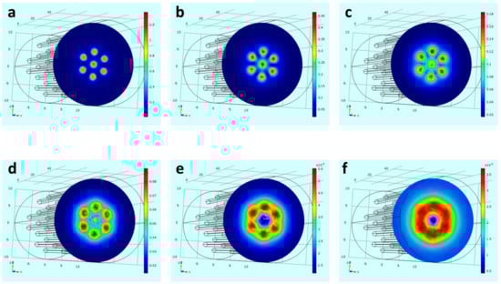 Simulated magnetic flux density (a) 0.1 mm from top (b) 0.5 mm from top (c) 1 mm from top (d) 1.5 mm from top (e) 2 mm from top (f) 2.5 mm from top. Color scale bar in [T].