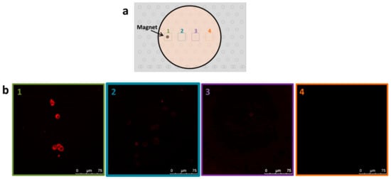 (a) Schematic illustration of cell culture dish with magnet location. Areas 1, 2, 3, and 4 indicate sites of imaging; (b) Confocal fluorescent images of PC12 cells at different locations relative to magnet, as marked in A; (c) Phase contrast images of differentiated PC12 cells at different locations relative to magnet, as marked in A. Scale bar = 50 µm.