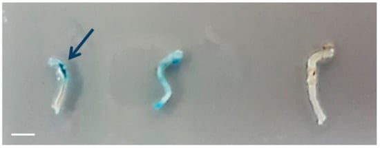 In vivo magnetic targeting in sciatic nerve model. Images of extracted sciatic nerves: Left: nerve injected with MNPs. A magnet tip was placed externally following injection, leading to MNPs accumulation near magnet (stained in blue). Middle: nerve injected with MNPs, without an external magnet. MNPs are distributed along the nerve. Right: Control (no injection of MNPs). Scale bar = 4 mm.