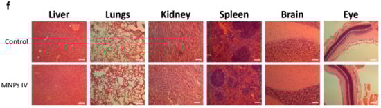 To validate the possible side effects and therapeutic relevance of the NGF-MNPs, we examined the whole-body biodistribution of the carriers following the treatment. Healthy mice were administrated with NGF-MNPs at a dose of 20 mg/kg intravenously and compared to control mice. Organ samples were collected and dissolved and the iron amount was quantified. ICP measurements indicate that the accumulation of MNPs in eyes at magnet site (right eye) was ~2-fold higher when compared to the passive accumulation of nanoparticles in non-targeted eyes (Figure 7e). A significant accumulation of nanoparticles was observed in the liver and spleen, as these organs play a role in clearance, similar to the bio-distribution profiles of the majority of other nanomaterials that are commonly used in biomedical applications [,]. No evidence of MNPs was found in brain and lungs. The body weights of the mice were recorded within the whole evaluation period of 18 days. No body weight loss was observed for the injected mice, showing that the administration of NGF-MNPs has no systemic influence. Histopathological images of liver, lung, kidney, spleen, brain, and eye show no observable pathological abnormalities, suggesting that the MNPs did not induce any damage to treated mice (Figure 7f). These preliminarily in vivo evaluations demonstrate the biocompatibility of NGF-MNPs for possible biomedical applications.