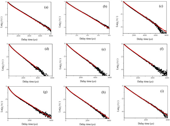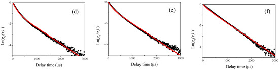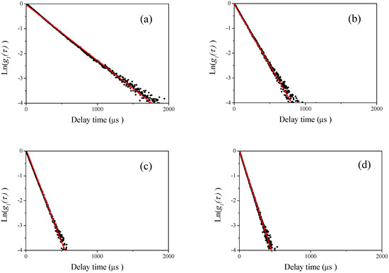 In Figure 8 and Figure 9, we show the curve-fitting performed using Equations (1) and (2) on the observed homodyne photon correlation functions. The black curves are the observed homodyne photon correlation functions from Figure 6 and Figure 7. Using Equations (1) and (2) and the g 1 ( τ ) obtained from the homodyne photon correlation functions for the single particle samples listed in Table 1, the theoretical homodyne photon correlation functions were calculated, as shown by the red solid curves. The curve-fitting could not be applied to the results of Figure 6a,b and Figure 7a, as obvious differences between the photon correlation functions were not found due to the effect of light scattered from larger submicron-sized particles masking the light scattered from 70-nm-sized polystyrene latex nanoparticles.