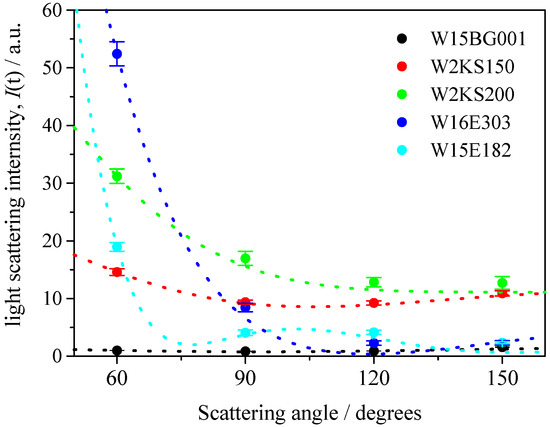 However, the effect of detection angle on the apparent size distribution determined by DLS should be also considered, as commercial DLS instruments typically have two different detector positions when measuring light scattering. One is at 90° and the other is at a larger angle and measures backscattering. It is known that even for narrow size distributions of particles in liquid phase, the existence of electrostatic interactions between particles affects the angular distribution of particle scattering, resulting in an angular dependency of the apparent mean size measured by DLS [15,16]. In addition, a higher polydispersity induces larger differences in the observed particle size, depending on the light scattering detector angles, although this is also related to the relation between incident laser wavelength and targeted size in the DLS assessment. In Figure 1, the relative light scattering intensities as a function of the scattering angle are plotted using Mie theory [17]. In this calculation, refractive indices of 1.59 and 1.33 were used for polystyrene latex particle and water, respectively. In the figure, the light scattering intensity for each particle is normalized by its theoretical value at a scattering angle of 60°. As shown, the relative light scattering intensities at various angles are strongly dependent on particle size. This indicates that understanding the angular dependency of the apparent size distribution of particles in liquid phases in DLS assessment is crucial.