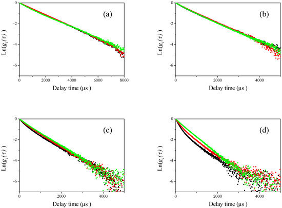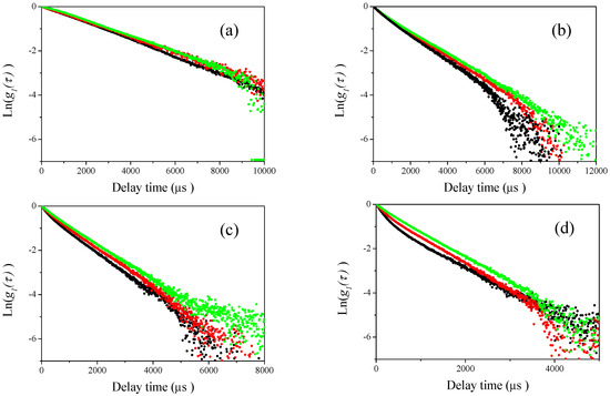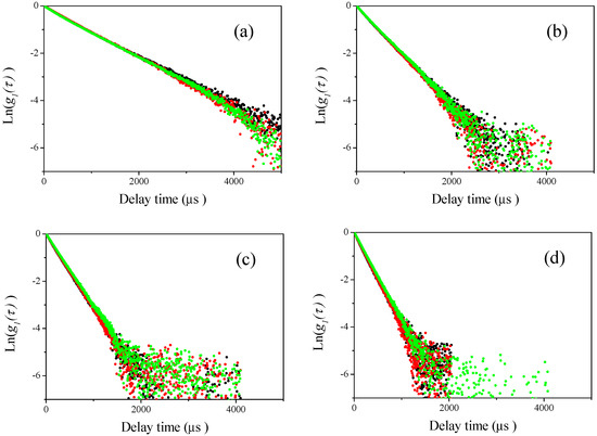 Figure 7. Example of observed homodyne photon correlation functions for polystyrene latex particles measured with DLS method (70-500-1 (black), 70-500-2 (red), and 70-500-3 (green)). (a) Light scattering was observed at a detector angle of 60°; (b) light scattering was observed at a detector angle of 90°; (c) light scattering was observed at a detector angle of 120°; and (d) light scattering was observed at a detector angle of 150°.