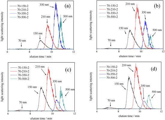Finally, to recognize the phenomena observed by DLS in this study, we performed AF4-MALS measurements for four samples (70-150-2, 70-210-2, 70-350-2, and 70-500-2). AF4 is an elution technique in which particles are separated by flow control in an aqueous solution [21,22,23]. In AF4, the retention time tr of nanoparticles can be predicted by Giddings’s theory [21], according to which the retention time of a nanoparticle is given by,