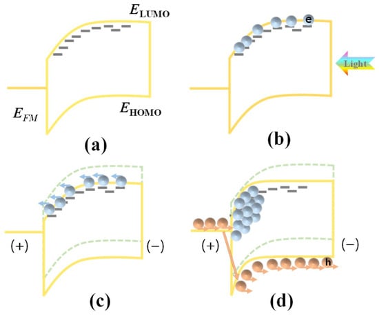 The premise of realizing the carrier tunneling effect is the formation of Schottky junction when the metal electrode is in contact with the semiconductor layer [39]. For the organic semiconductor with a large number of electron traps, the proper Schottky band bending without bias is shown in Figure 2a. It corresponds to the case when the Fermi energy level of the metal electrode (EFM) is higher than that of the organic semiconductor material (EFS). In such a case, electrons flow from metal into the semiconductor, yielding a built-in electric field toward the semiconductor with a downward energy band bending, thereby hindering the diffusion of holes in the organic semiconductor to the electrode. To achieve such a downward band bending, low work function electrodes like Ag (4.26 eV), Al (4.28 eV), and Mg (3.66 eV), are required. After light illumination, photo-generated electrons are captured by the electron traps as shown in Figure 2b. When a bias is applied with the electric field pointing from electrode to the semiconductor (reverse bias if the electrode works as cathode; forward bias if the electrode works as anode), the trapped electrons transport toward the Schottky junction as shown in Figure 2c. In the junction region, these arrived electrons narrow the Schottky junction and thus enhance the intensity of the built-in electric field, causing the holes to tunnel through the junction and inject into the organic semiconductor from the external circuit, and finally resulting in the current multiplication effect, as shown in Figure 2d.