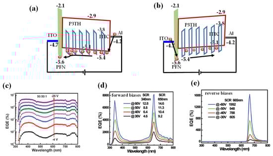 (a,b) Energy level diagrams of the PFN device under reverse forward biases under dark; (c) EQE spectra under different biases of the ITO/PEDOT:PSS/P3HT:PTB7-Th:PC71BM (50:50:1)/Al device (Reproduced with permission from [79]. Royal Society of Chemistry, 2015); (d,e) Narrowband EQE spectra of the ITO/PFN-OX/P3HT:PC61BM (4.0 μm)/Al device under different biases (Reproduced with permission from [92]. Royal Society of Chemistry, 2017).