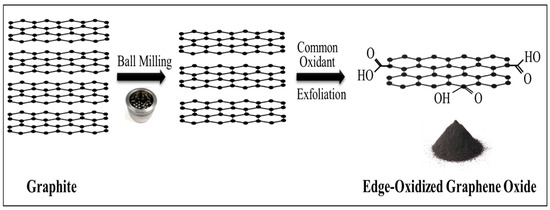 Edge-oxidized graphene oxide was supplied by Garmor, Inc. (Orlando, FL, USA) [24]. The production process of EOGO used in this research is different from the common chemical processes to produce GO such as Hummers’ method [30]. EOGO is produced by a ball milling process of graphite powder with an oxidizing agent in a controlled environment such as optimum shearing and minimized collision forces, whereas the production of GO depends on a chemical process involving strong agents and acids such as KMnO4, H2SO4, and H2O2 [30]. The ball milling process oxidizes the graphite along the edges while the milling media simultaneously exfoliates the layers in a zipper-like fashion. This process yields edge-oxidized graphene oxide that is composed of a few layers of graphene. In addition, Figure 2 shows the manufacturing process of ball-milled EOGO.
