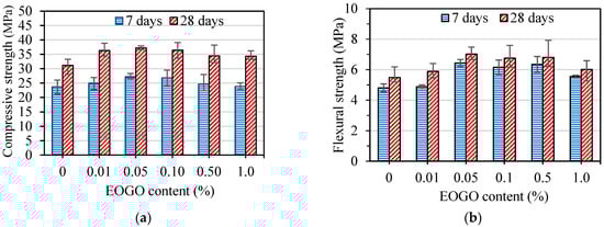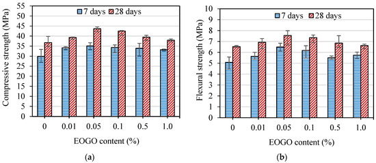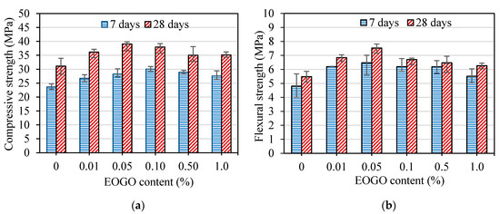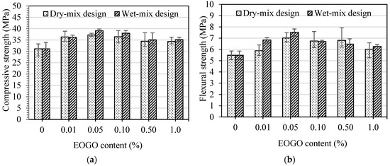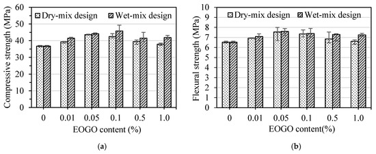 (a) Compressive strength and (b) flexural strength of EOGO-cement pastes with the wet-mix design method.