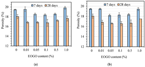 Figure 11a shows the relationship between the porosity of the control mix and the mixes with different EOGO contents cured at 7 and 28 days utilizing the dry-mix design method. In addition, it can be clearly seen that the porosity of the GPD samples at 7 days slightly decreased when the EOGO contents were 0.05% and more when compared to the control cement paste (CP). The porosity of all GPD specimens cured at 28 days was less than the CP. This indicates that the addition of EOGO using the dry-mix design reduces the porosity of EOGO-cement paste specimens. However, the reduction in the porosity of EOGO-cement pastes at 7 and 28 days was not significant. For instance, the greatest reduction in the porosity cured at 28 days was around 5% when the EOGO content was 0.1%.