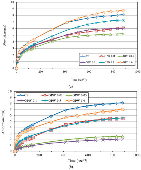 The water sorptivity of EOGO-cement composites were measured over nine days. Sorptivity is recognized as a significant index of concrete durability. Figure 13 shows the results of water sorptivity for control mix (CP) and EOGO-cement paste (GPD) mixes cured at 28 days. Figure 13a,b describes the water sorptivities of EOGO-cement pastes made of dry and wet-mix design methods, respectively. The graphs in Figure 13 plot the water absorption responses on the y-axis against the square root of time on the x-axis according to ASTM C1585-13 [35]. The water absorption process can be divided into two main phases, which are an initial sorptivity and a secondary sorptivity. The initial sorptivity is a linear regression measured up to the first 6 hours and the second sorptivity is a linear regression measured from day 1 to day 9. The addition of EOGO in the cement matrix using the dry-mix design was found to be effective in reducing the water suction mainly in GPD 0.01, GPD 0.05, and GPD 0.1 samples as shown in Figure 13a. The results of the initial and secondary sorptivity are presented in Table 4. The sorptivity of GPD 0.01, GPD 0.05, and GPD 0.1 were reduced by 19.7%, 29%, and 23.5%, respectively for the initial sorptivity and 20%, 48.6%, and 22.9%, respectively for the second sorptivity compared to CP. In addition, the results show that adding 0.5% and 1.0% of EOGO to cement paste mix (GPD 0.5 and GPD 1.0) has no or negative effect on the initial and secondary sorptivity. This agrees with the porosity test which illustrates higher porosity of GPD 0.5% and 1.0% at 28 days among the other percentages.